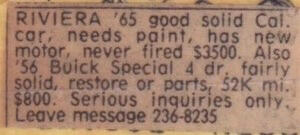 The Riviera was purchased by Chris Dursa on May 15, 1993 from the above listing. Chris restores and races Buicks in Ohio for hobby. As a child, Chris remembers his father owning the 1965 Riviera model, which is probably why he took such pride in this vehicles restoration.